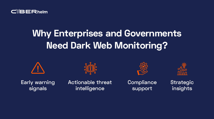 For enterprises, brand reputation and customer trust are on the line. For government entities, data exposure can endanger national security. Dark Web Monitoring provides: